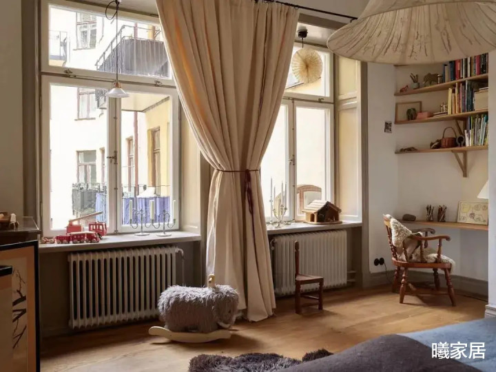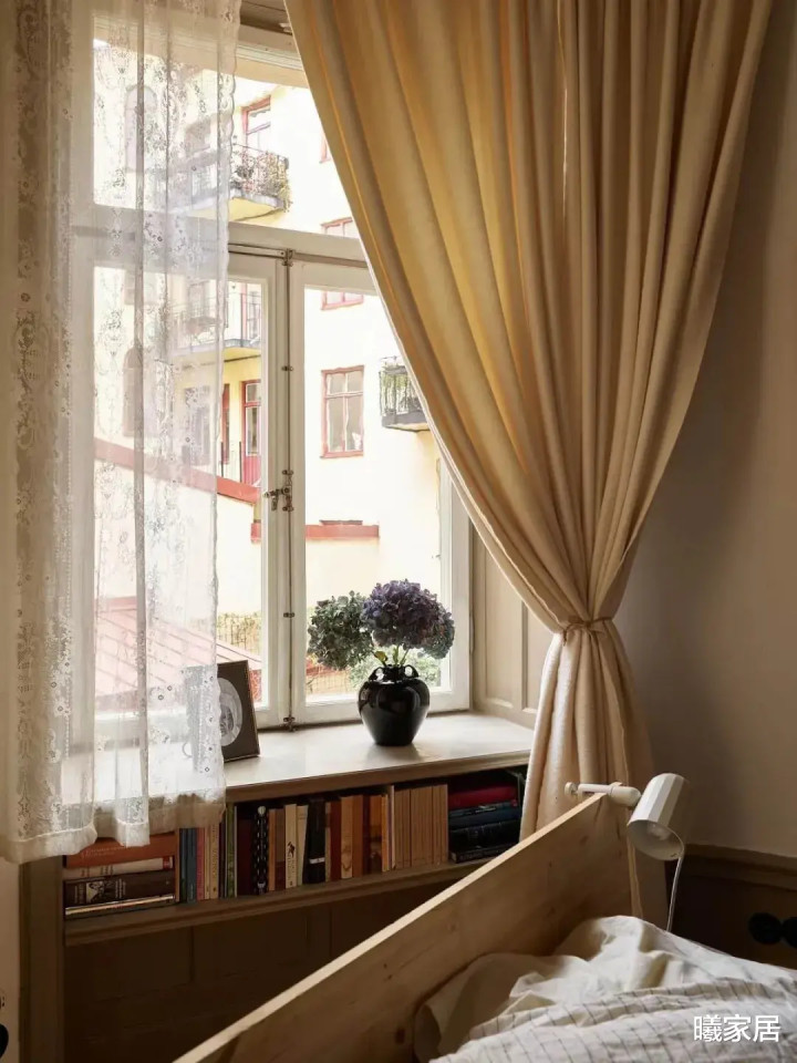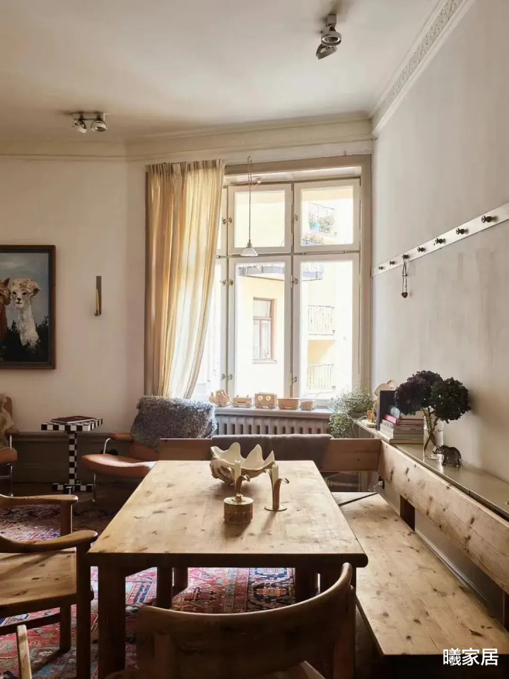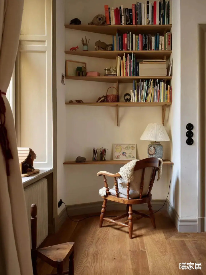 这个家里的米色调和中古家具,打造出复古情调简直如老电影一样有质感。每一处的宁静都有秩序和高级高。比如在这里,落地窗帘,打磨过的旧椅子,还有原木书架上的书籍摆件,赋予老房子精气神,又不缺少现代生活的气息。