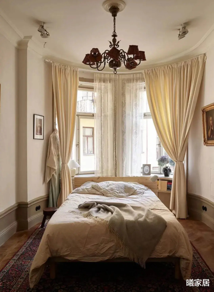 内饰几乎都是单色,主要颜色又是米色调,加上木质元素和灯座、高踢脚线、古董装饰的组合,在这个卧室里创造了一种非常柔和甚至精致的Vintage搭配,且还有大面积高挑的窗户来采光,让整个空间明朗又温柔。