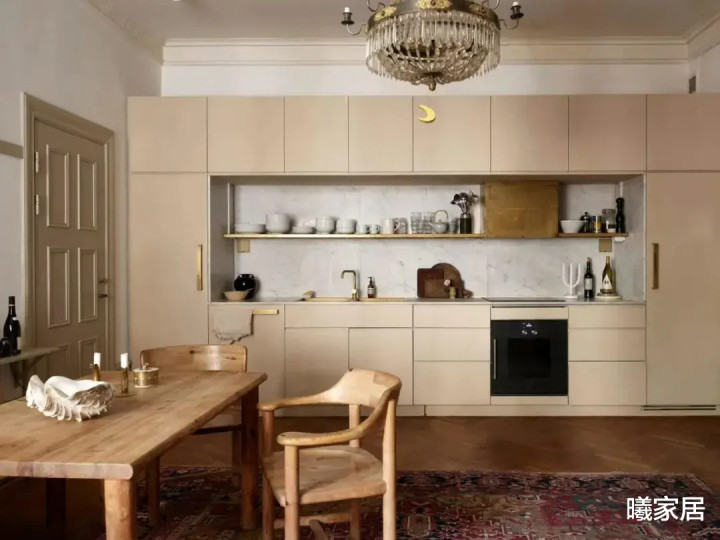 橱柜也同样是米色调,拥有现代的设计,遇上灰白大理石的纹理,气质组合更加显得静谧温柔。在这里,我们看到一种优雅极简的北欧厨房美学 。