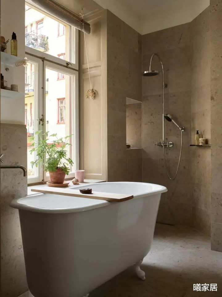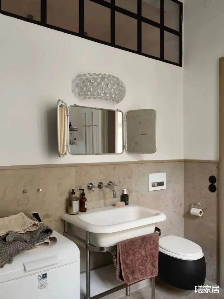 一般来说,老公寓的卫浴空间令人神伤,不管空间还是结构都很难满足现代人需求,也是很多老房改造的重点。这里依然用米色白色和黑色的简单配色,加入一些复古风格的物件,比如镜子、浴缸来营造vintage质感,同时通过玻璃隔断等让空间变得更加通透,没有了阴暗压抑,只留下惬意优雅的氛围。