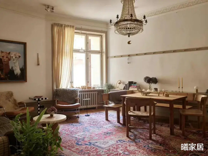 把客、餐、厨三个重要的功能区都集合在一个房间内,区域规划和家具物品的布置都特别考验功力。窗户不大,所以尽可能不遮挡光线。同时,在温暖斯堪的纳维亚风格指引下,原木家具搭配烛台、色彩丰富的地毯等装饰品,让家居空间显得更加复古。