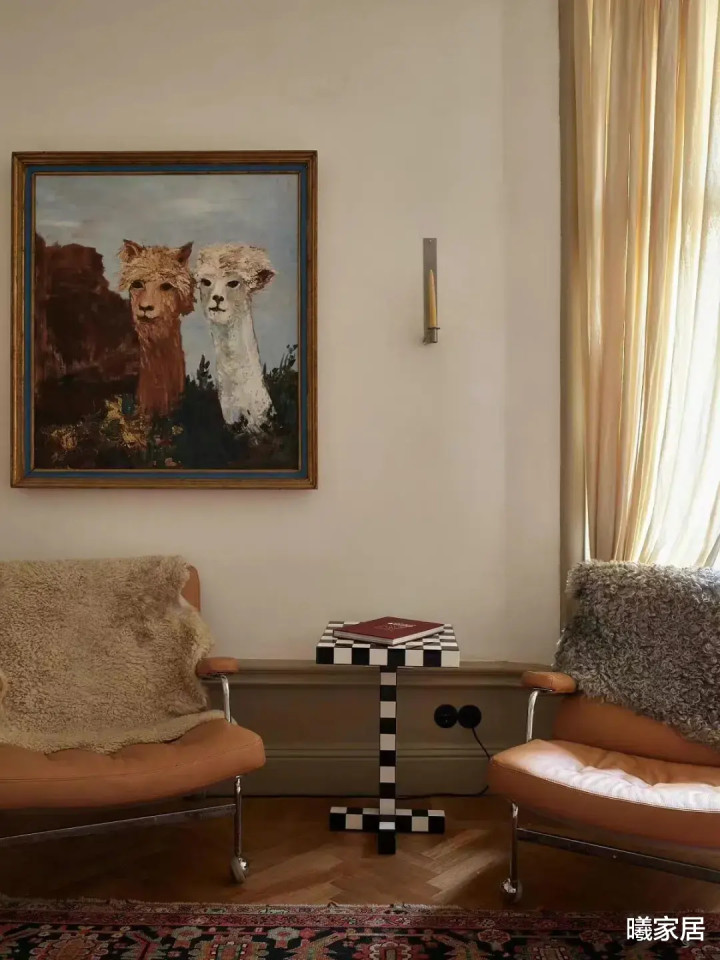 米色棕色都是低调温暖的中性色,自带舒适温度。上世纪中期现代风格的金属皮革椅,出众的棋盘格小边几,简单的物件搭配起来显得柔和又宁静。即使只是一个角落,也一样温馨复古很迷人。