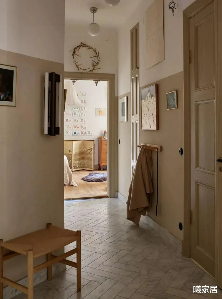 因为是老建筑,喜欢怀旧的主人投入了更多的爱来修复细节。柔和的米色调墙面,错落有致的装饰画,新的大理石纹理地板给这个入口空间增添了自然的光泽,使得整体看起来更加优雅精致。