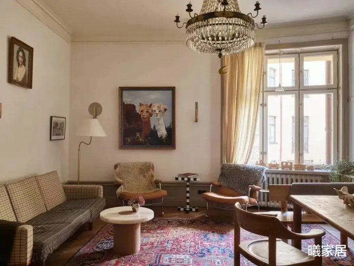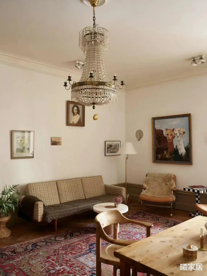米色调本身气质很温柔很高级,而运用在这个老房子里,和带着时间印记的格子沙发、手工地毯,以及华丽的水晶灯一起更是绝配。加上老建筑挑高的结构,也让整体看起来更加大气明亮。